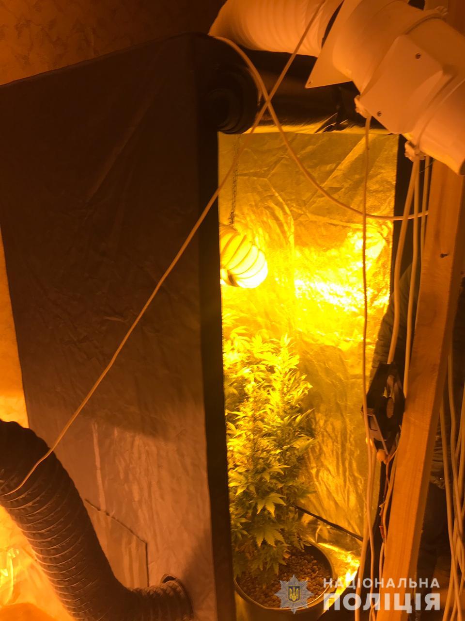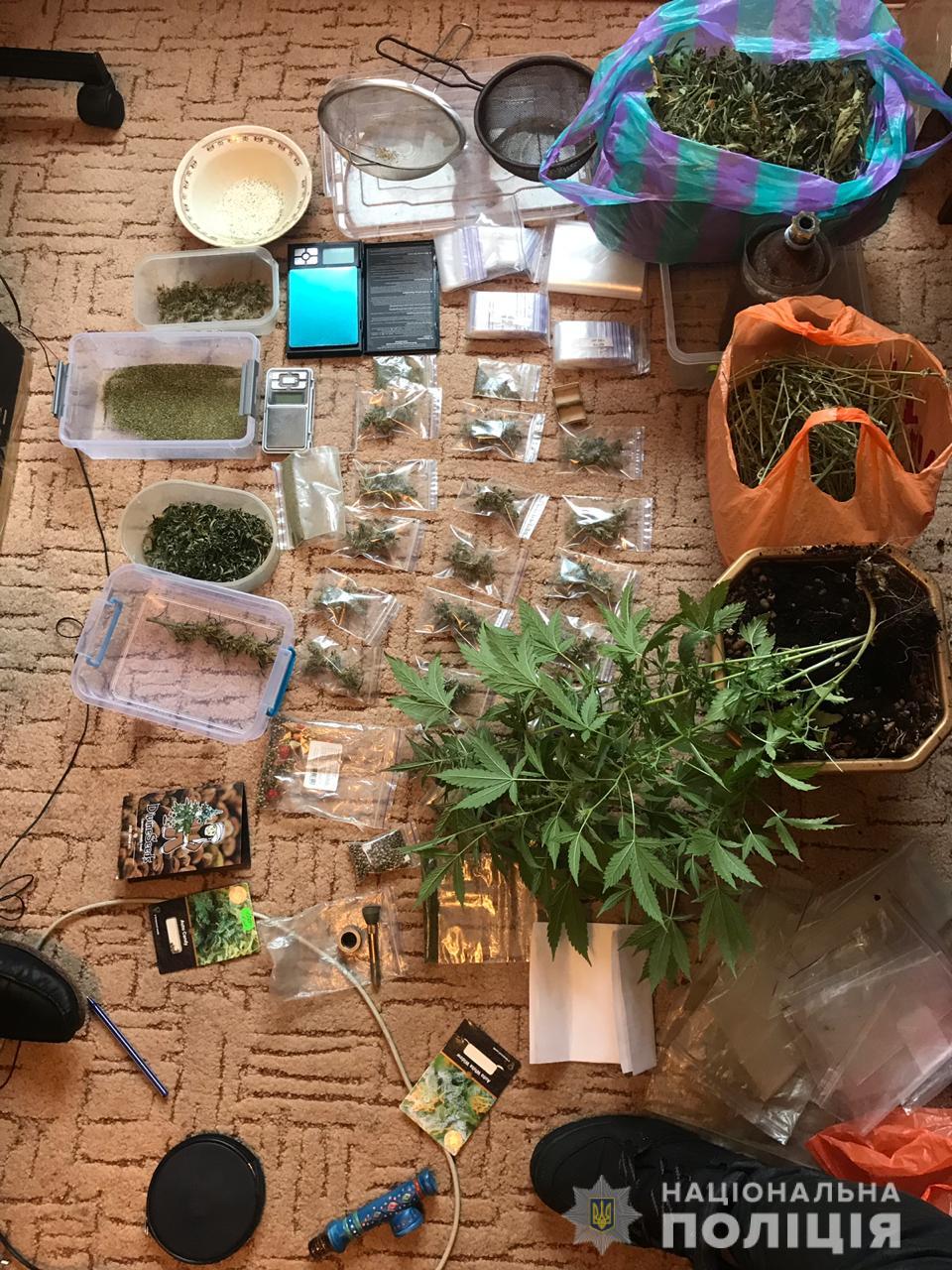 Також в ході санкціонованого обшуку поліцейські виявили розфaсовані полімерні пакети та пластикові контейнери з канабісом, виготовленим з елітних сортів рослин конопель загальною вагою близько 70 грамів, 4 горщика для квітів з кущами конопель, ваги та металеве сито.