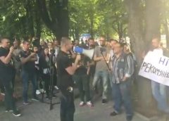 Представники чотирьох громадських організацій пікетували біля відновленого погруддя радянському маршалу. Постамент у цей час захищали невідомі в масках.