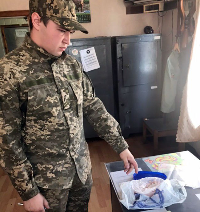 “В ході огляду було виявлено пластиковий судок із м’ясним фаршем, в середині якого знаходився поліетиленовий згорток з порошкоподібною речовиною білого кольору невідомого походження”, – йдеться у повідомленні.