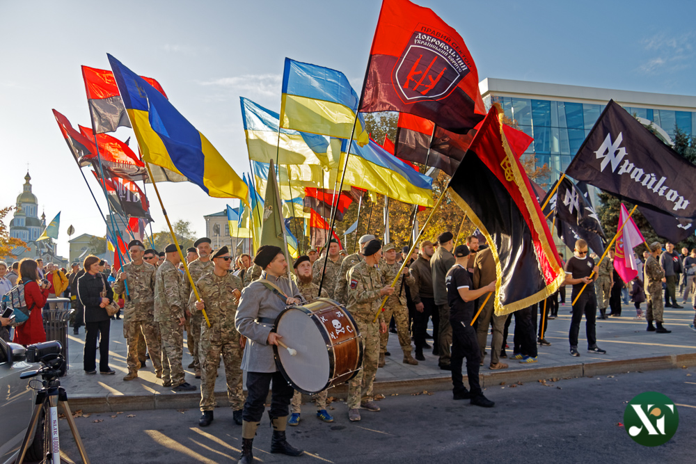 Учасники ходи тримали національні та чорно-червоні прапори, а також прапори організацій “Правий сектор”, “фрайкора”, “Антикорупційний блок учасників АТО” та інших.