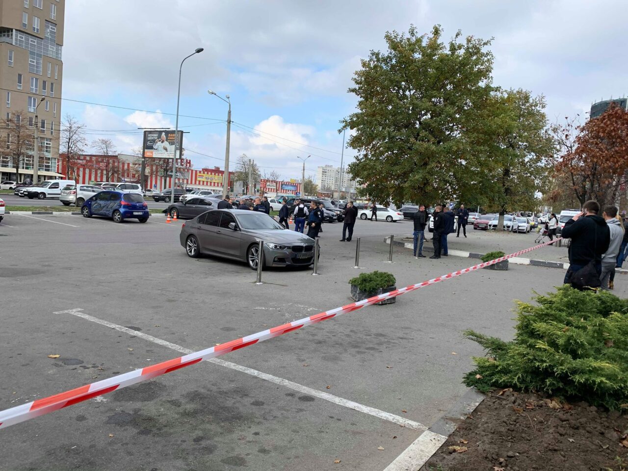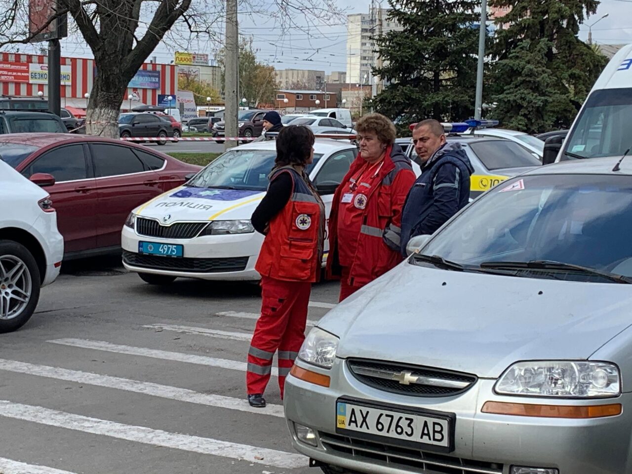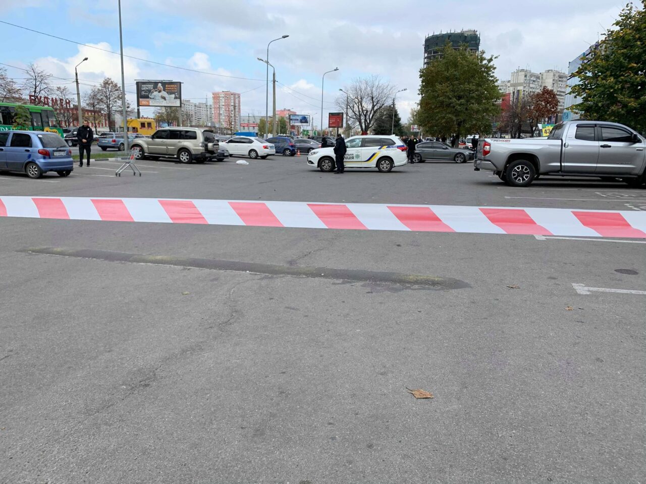 Пораненого відвезла “швидка допомога”. Парковку перед супермаркетом оточили поліцейські. Зброя, з якої стріляли, лежить на землі.