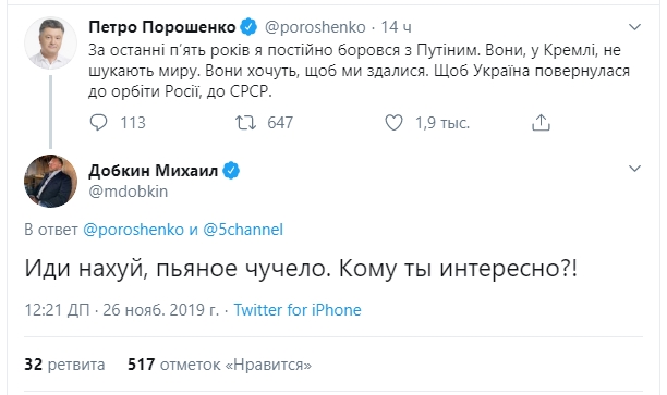 Екс-депутат Верховної Ради, колишній мер Харкова Михайло Добкін вступив у перепалку з п’ятим президентом України Петром Порошенко після публікації останнього в Twitter.