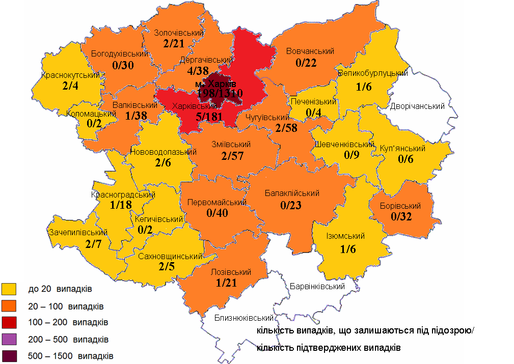 За даними Харківського обласного лабораторного центру, найбільша кількість хворих – в Харкові (1310 випадків) та Харківському районі (181 випадок). Всього з початку реєстрації в області зафіксовано 3107 підозр на коронавірус, в тому числі 65 – за минулу добу. 1946 випадків лабораторно підтверджено, 935 підозр спростовано. Залишаються під підозрою 226 осіб, 198 з них – жителі Харкова.