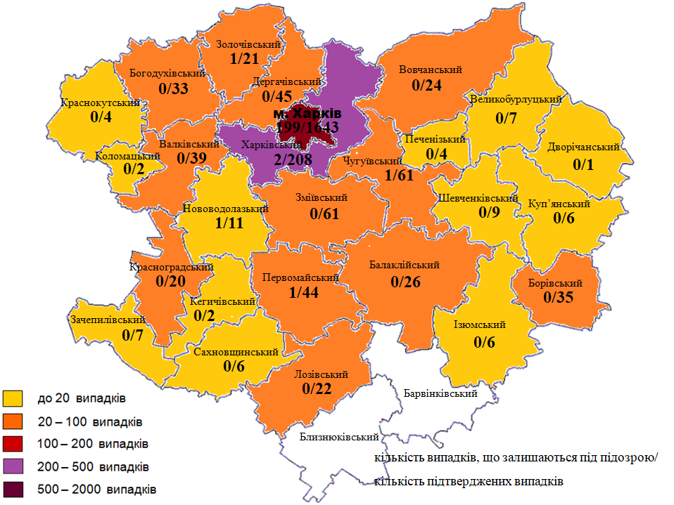 За даними Харківського обласного лабораторного центру, найбільша кількість хворих – в Харкові (1643 випадки) та Харківському районі (208 випадків). Всього з початку реєстрації в області зафіксовано 3692 підозри на коронавірус, в тому числі 41 – за минулу добу. 2347 випадків лабораторно підтверджено, 1140 підозр спростовано. Залишаються під підозрою 205 осіб, 199 з них – жителі Харкова.