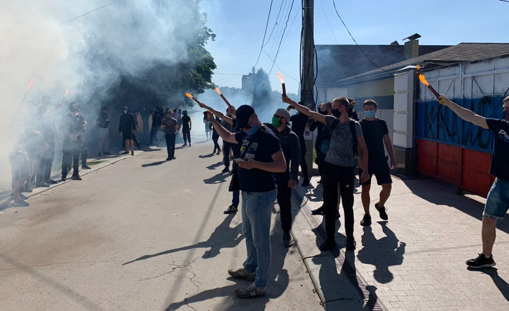 На місце події виїжджала слідчо-оперативна група та керівники Шевченківського відділу поліції. За адресою поліцейські виявили розмальований паркан домоволодіння та двох потерпілих чоловіків – у віці 22 та 32 років. З тілесними ушкодженнями їх доставили до лікарні.