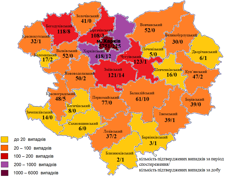 Найбільша кількість хворих зареєстрована в Харкові – 5751 випадок, 225 з них – за минулу добу. У Харківському районі COVID-19 хворіють 418 осіб.