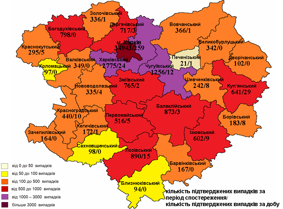 Найбільша кількість хворих зареєстрована в Харкові – 34 943 випадки, 259 з них – за минулу добу. У Харківському районі з початку пандемії зареєстровано 2 775 хворих СOVID-19.