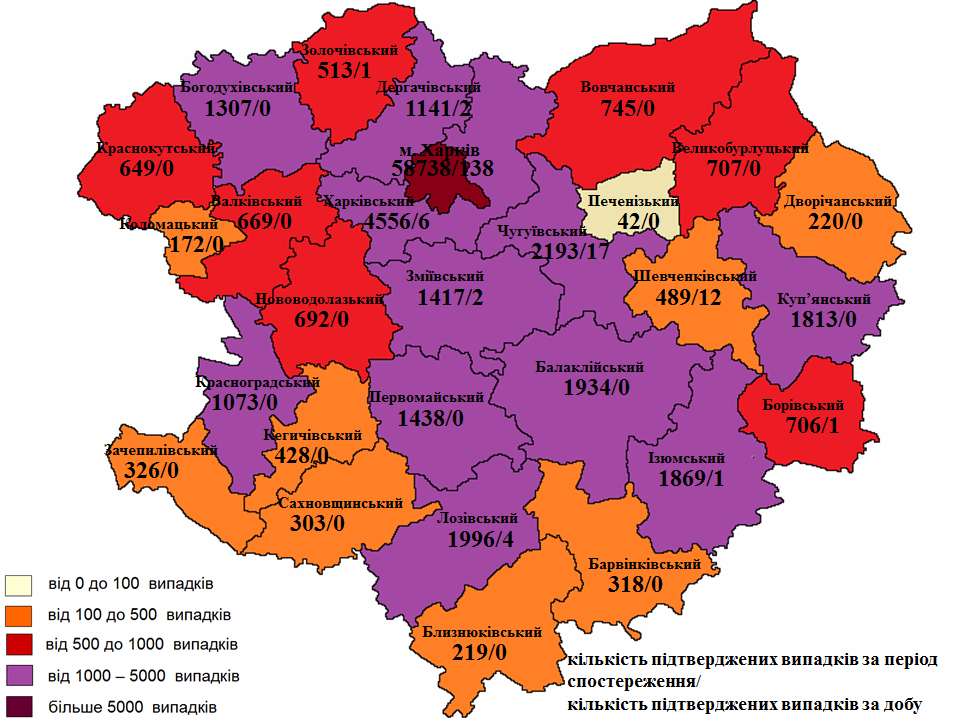 Найбільша кількість хворих зареєстрована в Харкові — 58 738 випадків, 238 — за минулу добу. У Харківському районі з початку пандемії зареєстровані 4 556 випадків захворювання на СOVID-19.
