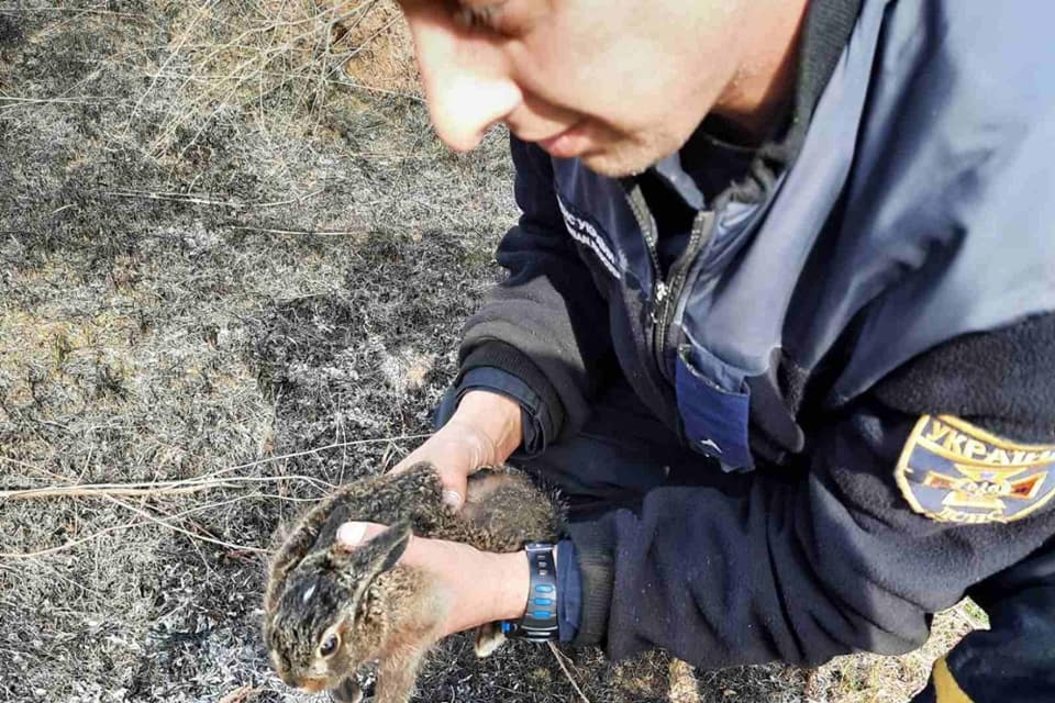 Під час ліквідації пожежі рятувальники побачили в палаючих кущах зайченя. Вони зловили переляканого звірка і випустили в лісосмугу.