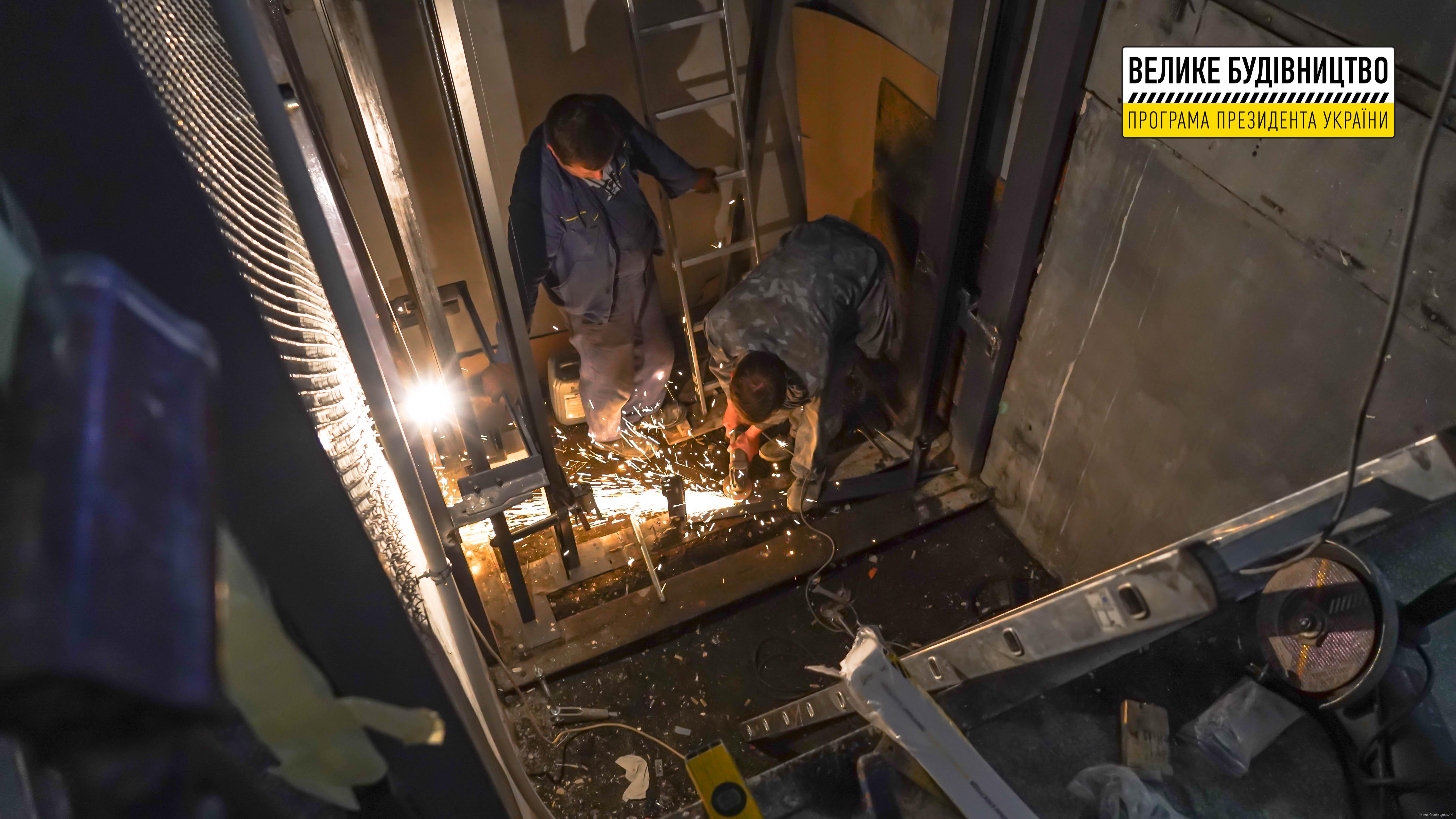 «Уже виконана металоконструкція шахти, сітчаста огорожа, встановлені напрямні ліфтів. Сьогодні підняли несну лебідку і встановили електроніку в машинне приміщення. Наступного тижня будемо встановлювати кабіну, вішати на троси і в налагоджувальному режимі монтувати електрообладнання. За два тижні стоятимуть портали під підшивку», – розповів Анатолій Васильєв.