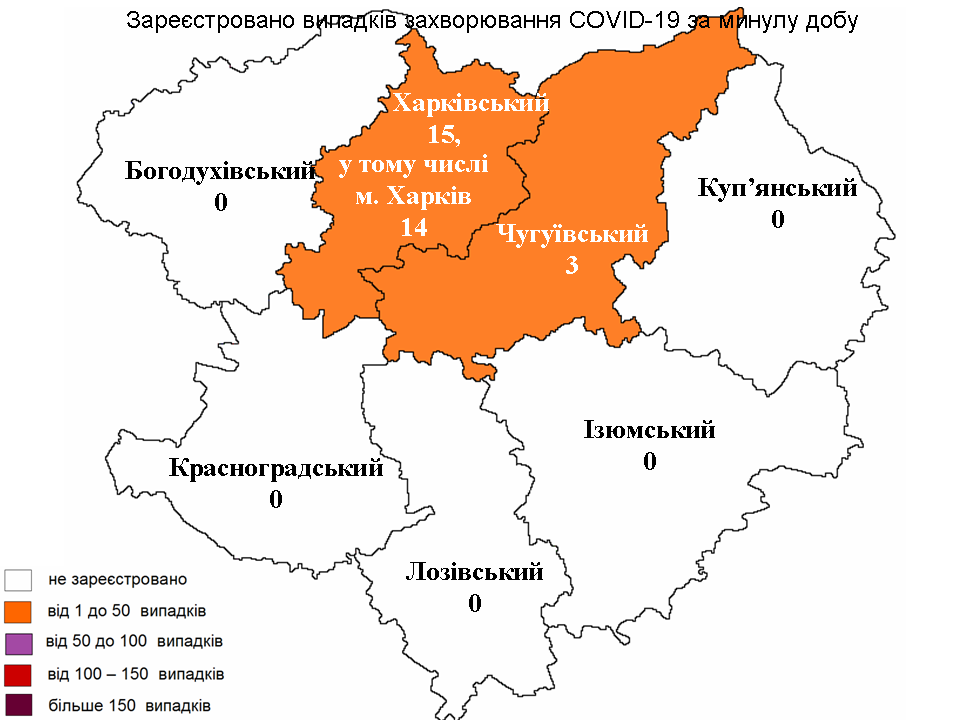 За минулу добу найбільшу кількість хворих COVID-19 зареєстрували в Харківському районі – 15 випадків, 14 – серед жителів Харкова. Три нові випадки виявили в Чугуївському районі.