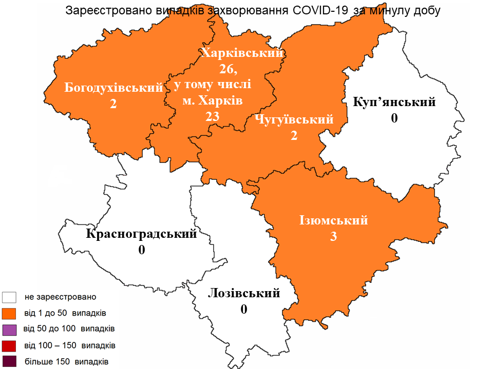 За минулу добу найбільшу кількість хворих COVID-19 зареєстрували в Харківському районі – 26 випадків, 23 – серед жителів Харкова. Три нові випадки виявили в Ізюмському районі. По два жителі захворіли в Богодухівському та Чугуївському районах.