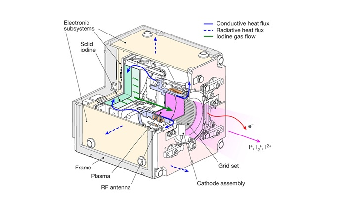 Розроблений ThrustMe твердотільний іонний силовий агрегат на йоді NPT30-I2 має скромні розміри – це куб 10х10х10 см. Усередині двигуна розташована ємність із кристалічним йодом, з’єднана з розрядною камерою, де в індуктивно зв’язаній плазмі відбувається його іонізація. На виході з розрядної камери розташована іонно-оптична система, де відбувається прискорення іонів. Також у корпусі розташовані численні електронні контролери, що дозволяють керувати силовим агрегатом.