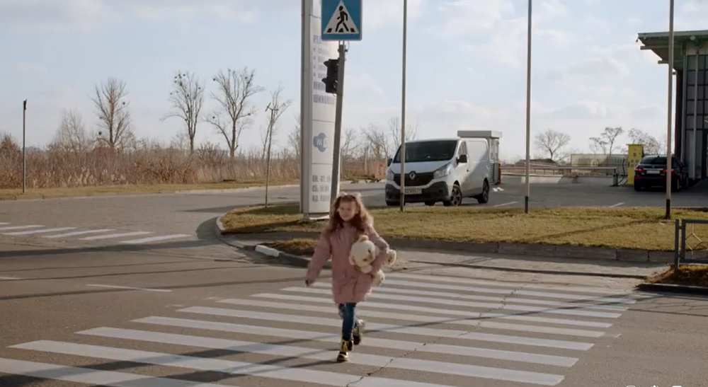 Наблизившись до пішохідного переходу, дівчинка ховає смартфон у кишеню та, дочекавшись зеленого сигналу світлофора, починає переходити дорогу. Але не встигає – вереск гальм, удар, і на дорозі залишається плюшевий ведмедик, що випав з дитячих рук. Наступний кадр – це заклик до всіх глядачів: “Збережи їй життя! не порушуй ПДР!”.