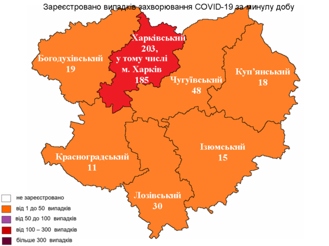 Минулої доби найбільшу кількість хворих на COVID-19 зареєстрували в Харківському районі — 203 випадки, 185 з них — серед мешканців Харкова.