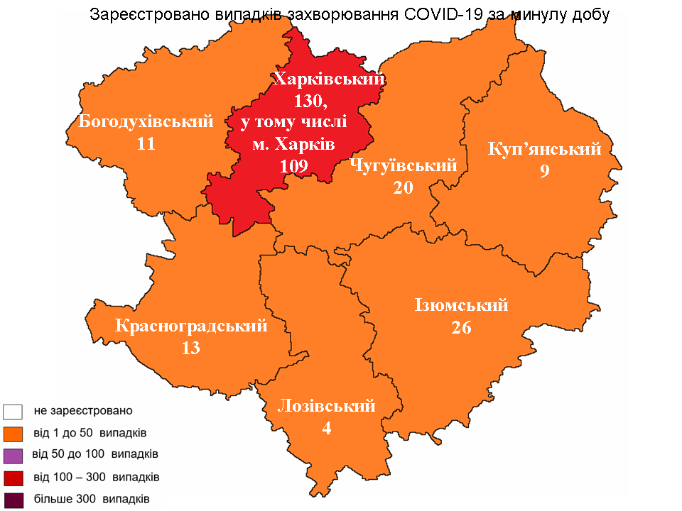 Минулої доби найбільшу кількість хворих на COVID-19 зареєстрували в Харківському районі — 130 випадків, 109 з них — серед мешканців Харкова.