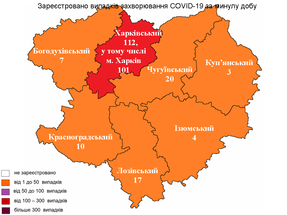Минулої доби найбільшу кількість хворих на COVID-19 зареєстрували в Харківському районі — 112 випадків, 101 з них — серед мешканців Харкова.
