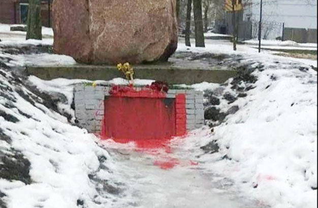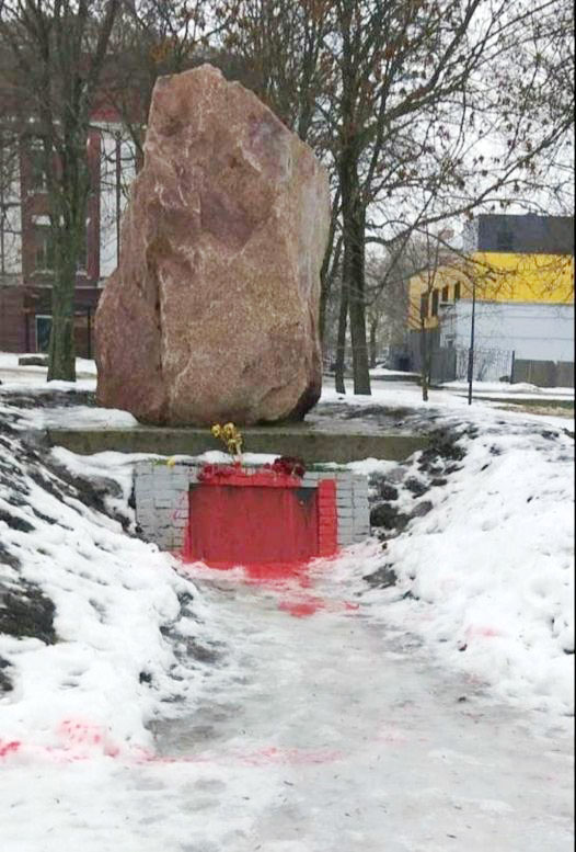 У Харкові поліція встановлює особи вандалів, які облили червоною фарбою пам’ятний знак загиблим воїнам УПА у Молодіжному парку.