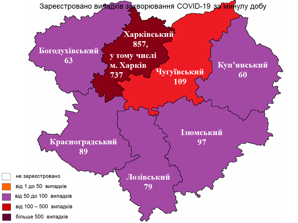 У Чугуївському районі захворіло 109 мешканців, в Ізюмському – 97, у Красноградському – 89.