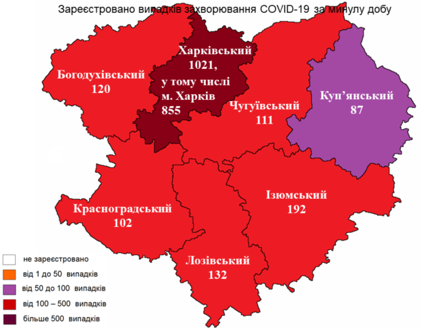 Минулої доби найбільшу кількість хворих на COVID-19 зареєстрували в Харківському районі — 1 021 випадок, 855 з них — серед мешканців Харкова.