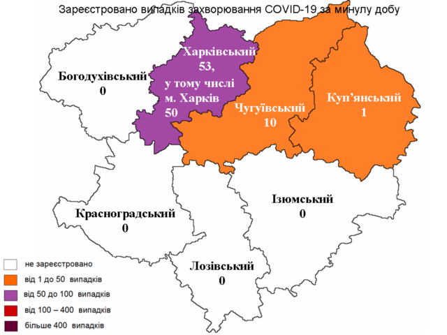 Минулої доби найбільшу кількість хворих на COVID-19 зареєстрували в Харківському районі — 53 випадки, 50 з них — серед мешканців Харкова.