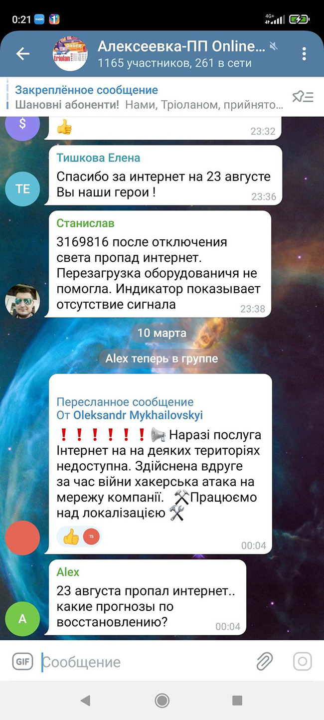Вночі з 9 на 10 березня в частини абонентів компанії «Тріолан», які мешкають на Павловому Полі та Олексіївці, зникло підключення до інтернету.