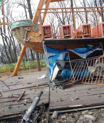 2 квітня внаслідок удару окупантів по Парку Горького у Харкові прозпочалася пожежа, також було пошкоджено декілька дитячих атракціонів.