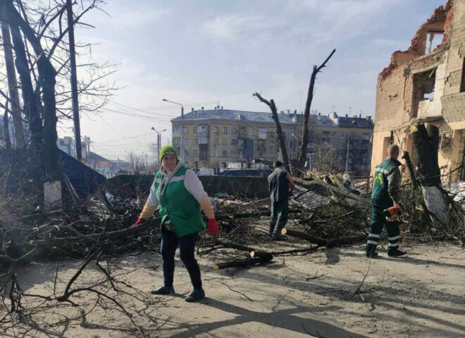 Комунальники прибирають дерева та гілки, що були пошкоджені або впали внаслідок обстрілів міста.