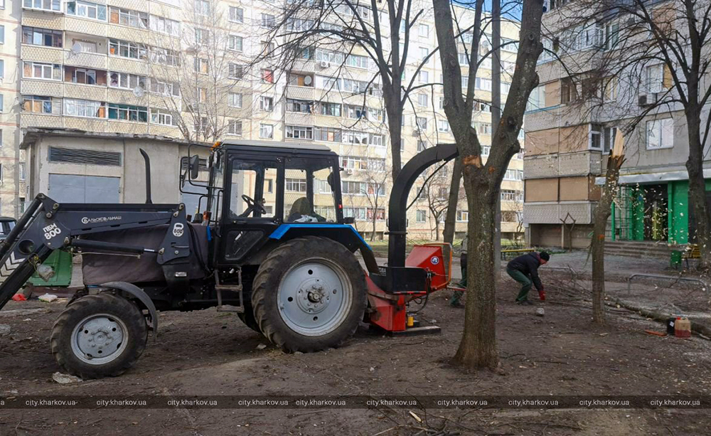 Робітники комунальних підприємств «Харківзеленбуд», «Харківжилбуд» та «Харківспецбуд» очищують прибудинкові території біля багатоквартирних будинків. Лише за цей тиждень комунальники прибрали 67 дерев та понад 100 великих гілок.