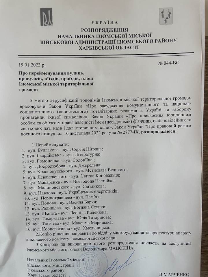 Менше ніж за два місяці в місті Ізюм Харківської області позбавилися 77 радянських та російських топонімів. Міська топонімічна комісія міста Ізюм Харківської області вчетверте приняла рішення про перейменування вулиць, яке схвалює голова Ізюмської міської військової адміністрації Валерій Марченко.