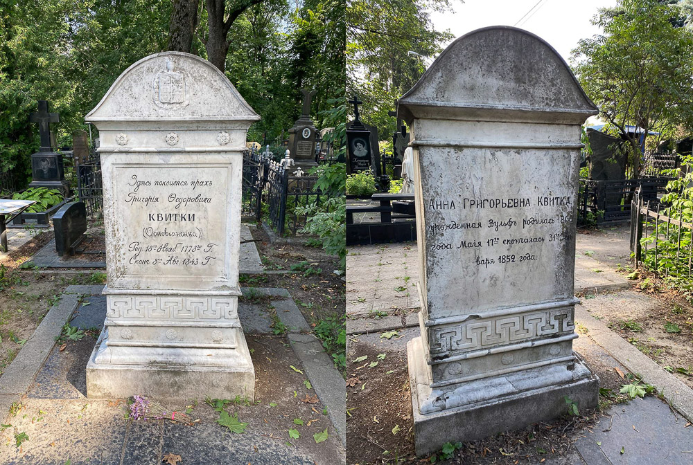 Наприкінці липня 1843 року Квітка-Основ’яненко тяжко захворів, хвороба мучила його одинадцять днів. Він помер 8 серпня 1843 року о п’ятій годині пополудні на руках коханої дружини та в колі рідних і друзів, серед яких були Микола Юрійович Квітка і Петро Петрович Гулак-Артемовський. Відспівував Квітку єпископ Інокентій, безліч містян проводжали покійного до місця поховання на Холодногірському кладовищі. Від білосніжного мармурового надгробка відкривався вид на Харків… Пізніше поруч знайшла вічний спочинок і дружина письменника Анна Григорівна, яка померла 31 січня 1852 року від сухот.