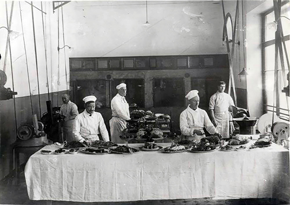 Наприкінці XVIII ст. у Харкові жили декілька десятків німецьких родин, серед них виділялись глави сімейств Густаф фон Буксгевден та Георг фон Мінстер — багаті й амбіціозні люди. Буксгевден у своєму маєтку проводив богослужіння за лютеранським обрядом, оскільки ця релігійна спільнота ще не мала кірхи, а після служби влаштовував обіди для парафіян. Окрім цього, і фон Буксгевден, і фон Мінстер регулярно влаштовували пишні вечірки і гулянки, де гостей потрібно було чимось годувати. Зазвичай ставали в нагоді шинка, окіст і ковбаси із власних окремих погрібців. Спочатку господарі закуповували смакоти на ярмарках у Харкові, та згодом вирішили, що краще готувати їх у своїх маєтках.