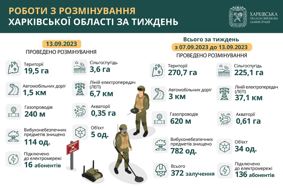 З 7 до 13 вересня включно на території Харківщини було знищено 782 вибухонебезпечні предмети. За цей період було розміновано майже 271 гектар території.