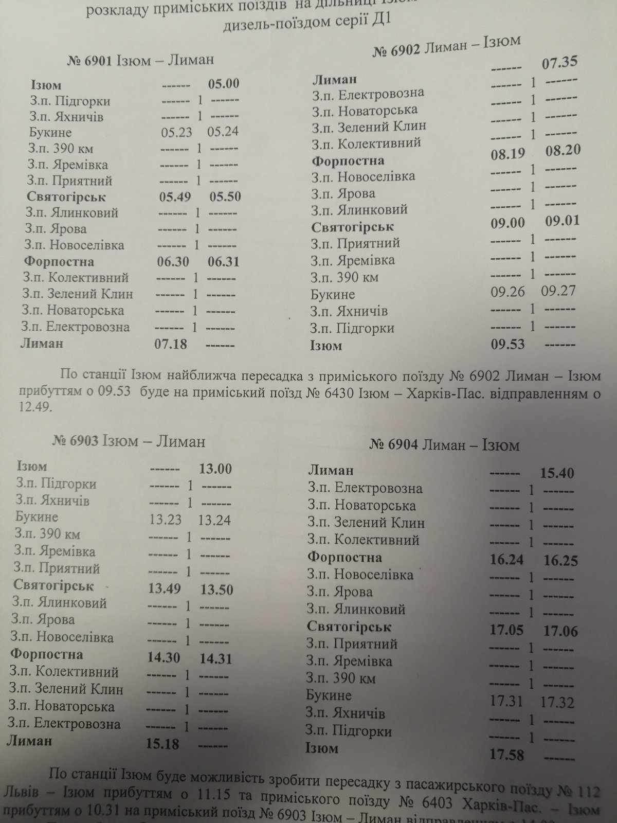 По ст. Ізюм буде можливість зробити пересадку з потяга № 112 Львів – Ізюм, який прибуває об 11:15, та з приміського потягу № 6403 Харків-Пасажирський – Ізюм, час прибуття о 10:31, на потяг № 6903 Ізюм – Лиман.