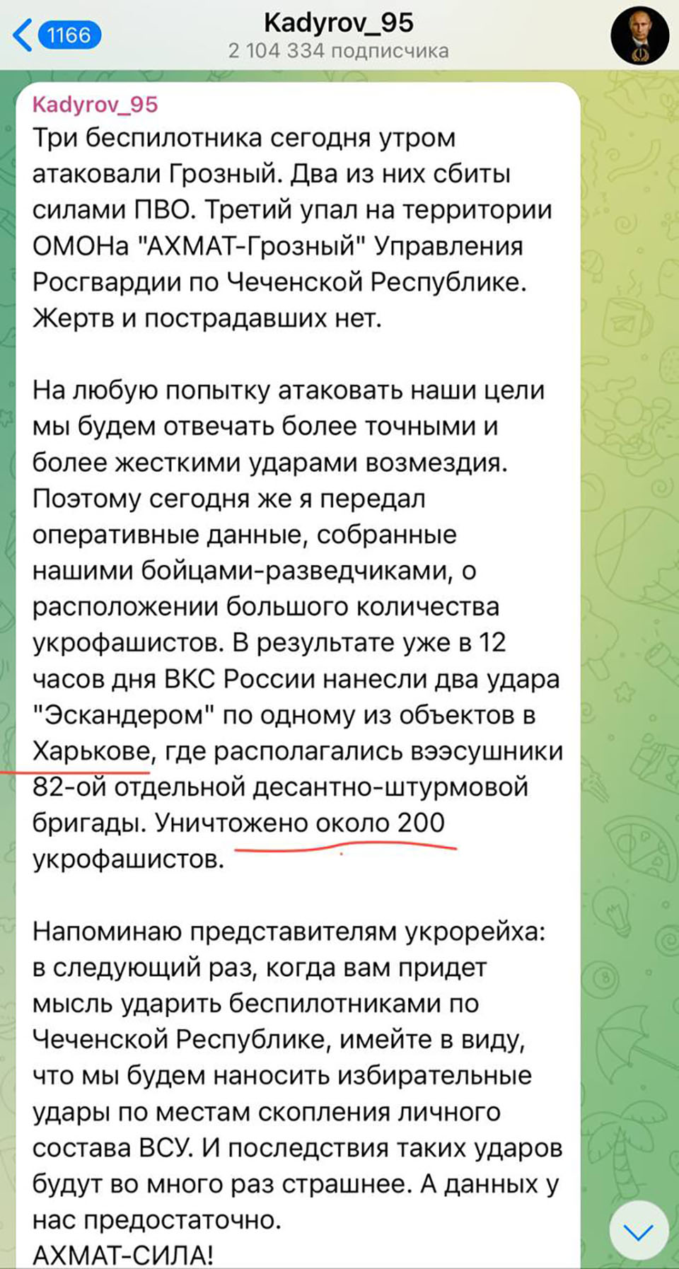 «Вже о 12 годині дня ВКС Росії нанесли два удари «Ескандером» (орфографія оригіналу збережена – ХТ) по одному з об’єктів у Харкові, де базувалися веесушники 82-ї окремої десантно-штурмової бригади. Знищено близько 200 укрофашистів», – так у перекладі з їхньої мови виглядає побєдна реляція голови малої, але войовничої російської республіки.