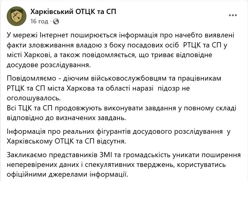 «У мережі Інтернет поширюється інформація про начебто виявлені факти зловживання владою з боку посадових осіб РТЦК та СП у місті Харкові, а також повідомляється, що триває відповідне досудове розслідування.
