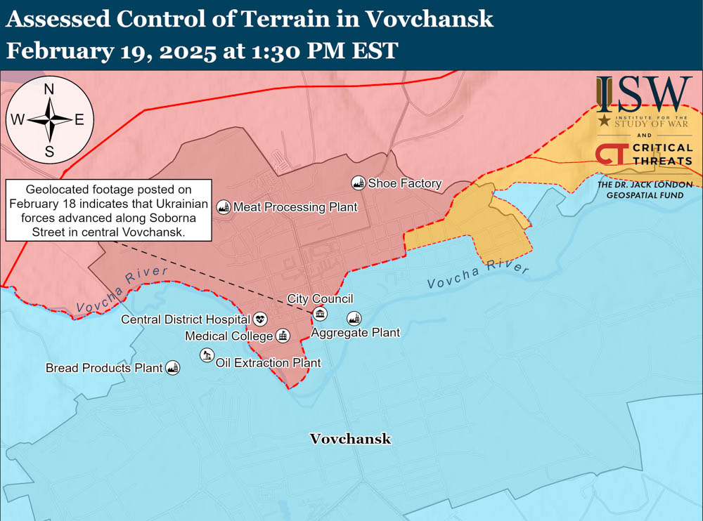 19 лютого російські війська продовжували обмежені наземні атаки поблизу Вовчанська.