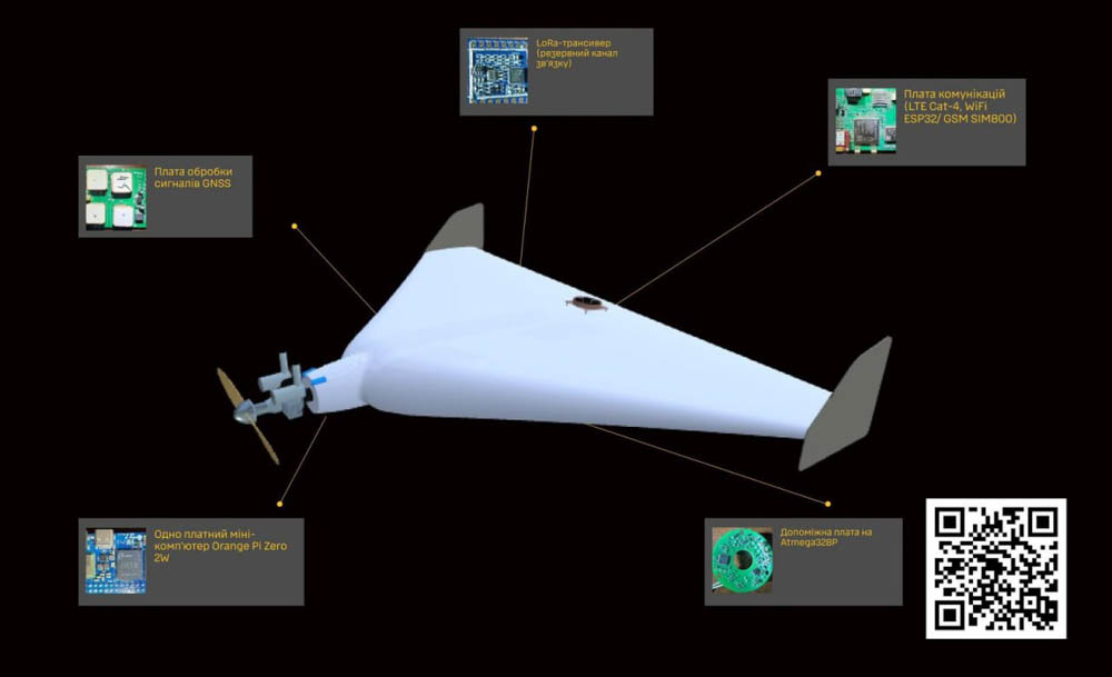 Майже половина компонентів безпілотника виготовлена в Китаї (модулі зв’язку, мінікомп’ютер, регулятор живлення, кварцовий генератор). Китайський двотактний бензиновий двигун DLE встановлений у носовій частині фюзеляжу, що робить дрон найбільш подібним до баражуючого боєприпасу “італмас” виробництва російської zala group.