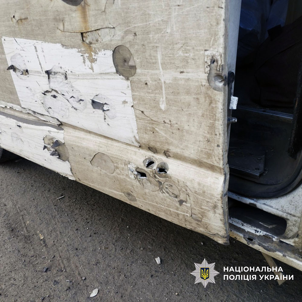 Відомо, що російський FPV-дрон «влучив у дорожнє покриття поряд зі службовим автомобілем правоохоронців». Автівка була пошкоджена.