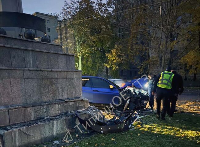 Ввечері вчора, 19 жовтня, на проспекті Незалежності в Харкові автівка BMW врізалася у стелу з Прапором України. Внаслідок аварії постраждали четверо людей у віці від 24 до 27 років.