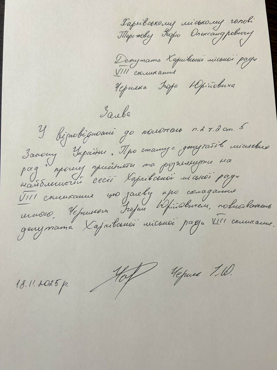 Про це Харків Times дізнався з повідомлення Черняка у Facebook.