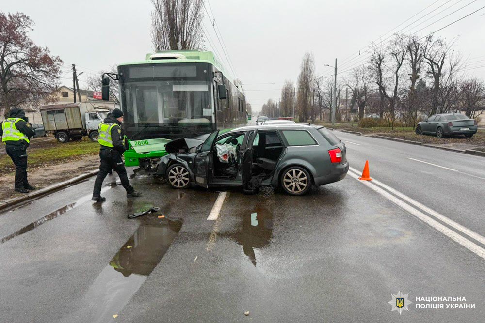 Повідомлення про аварію на проспекті Байрона надійшло до поліції близько 05:50. За попередніми даними, водій Audi не впорався з керуванням, виїхав на зустрічну смугу та зіткнувся з тролейбусом.