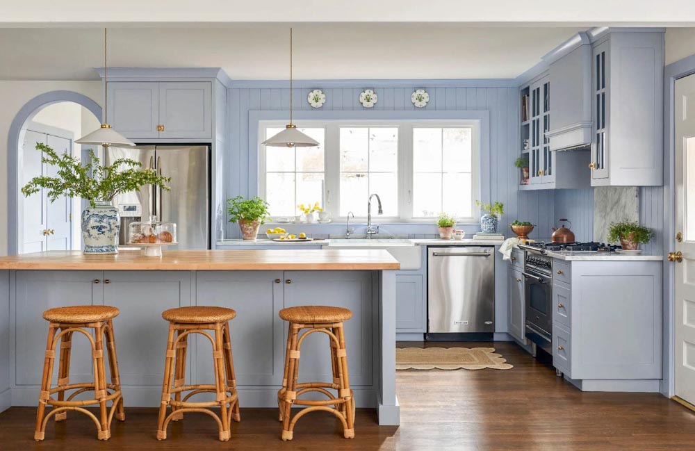 Щоб колір працював на повну силу, необхідно правильно поєднувати фактури та відтінки. Наприклад, матові насичені фасади чудово контрастують зі світлою стільницею під камінь чи дерево.