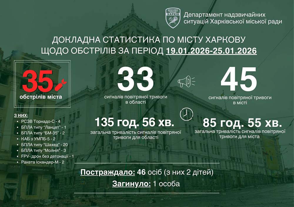 На минулому тижні росіяни обстрілювали Харків 35 разів. «В діло» пішло все: ракети, керовані авіабомби, РСЗВ та безпілотники. Лише за одну ніч на суботу місто атакували 25 бойових БпЛА.