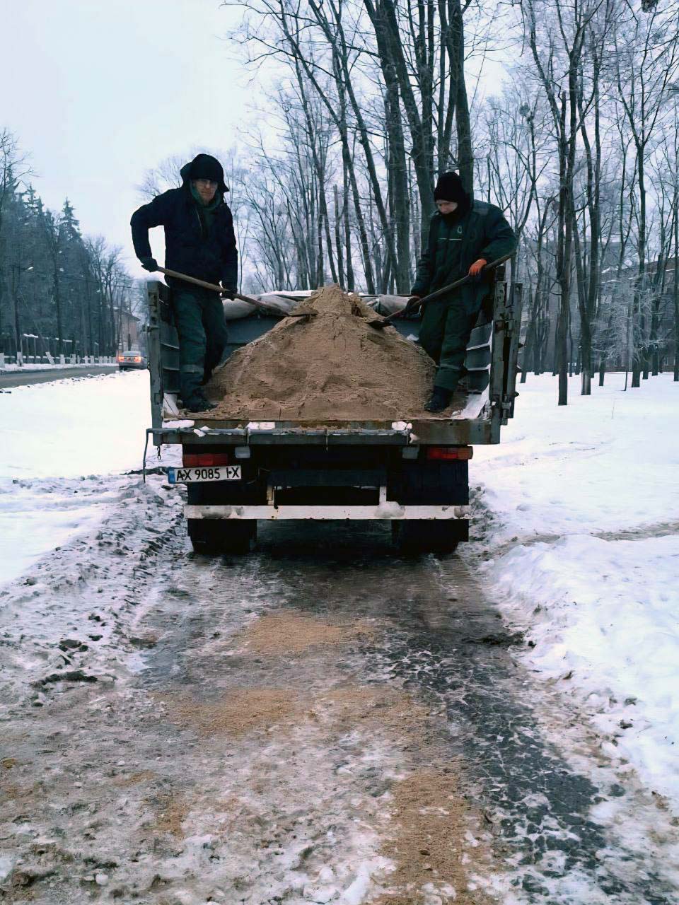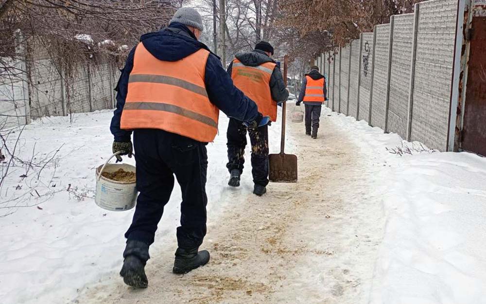 Фахівці СКП «Харківзеленбуд» посипають піщано-сольовою сумішшю доріжки, сходи та алеї парків і скверів.
