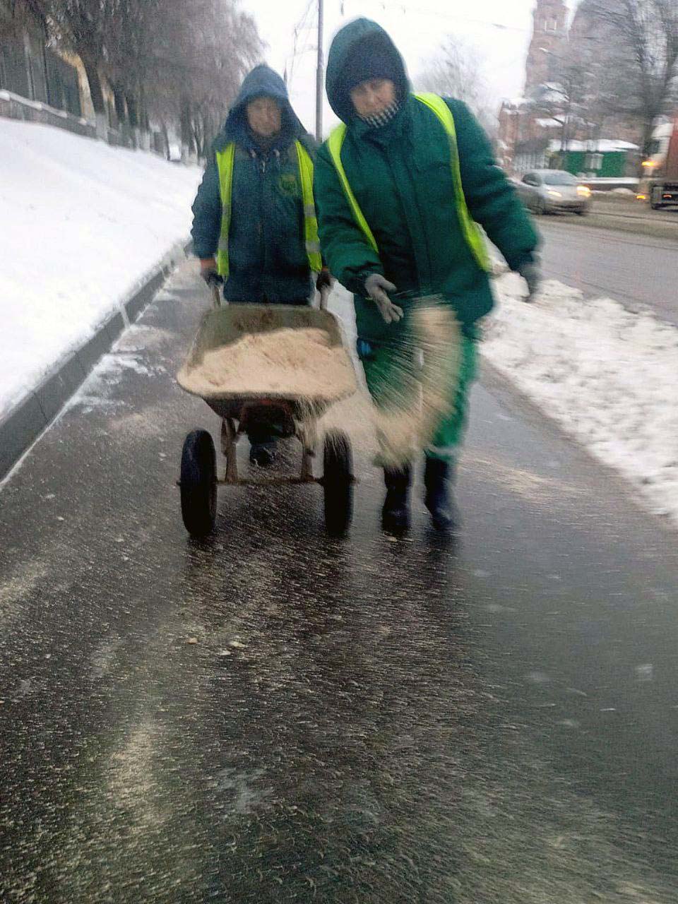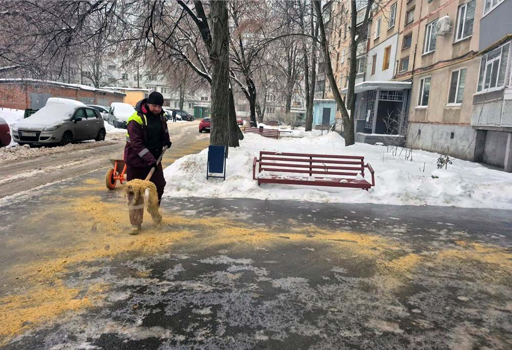 Бореться з ожеледицею і обласний центр. Як повідомили Харків Times у Харківській мерії, зранку працівники КП «Шляхрембуд» посипають піщано-сольовою сумішшю прибудинкові території, пішохідну та проїжджу частини.