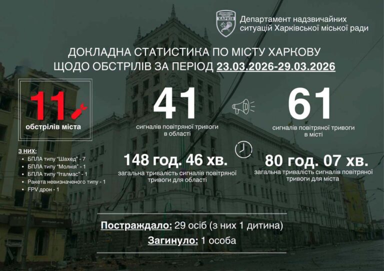 Протягом минулого тижня росіяни обстрілювали Харків 11 разів. Під ударами перебували Немишлянський, Основ’янський, Слобідський, Новобаварський та Холодногірський райони міста. Постраждали 29 мирних містян, серед них – дитина. На жаль, одна літня жінка загинула.