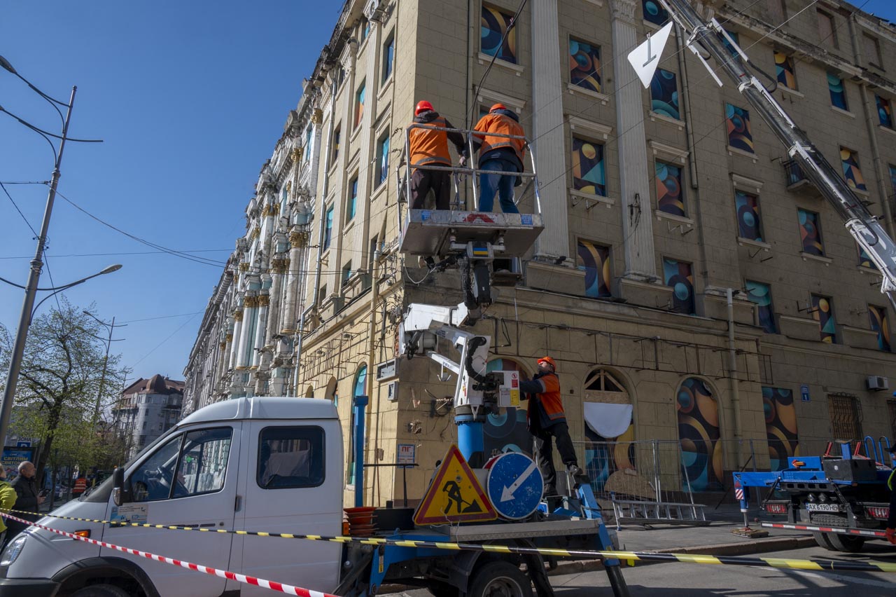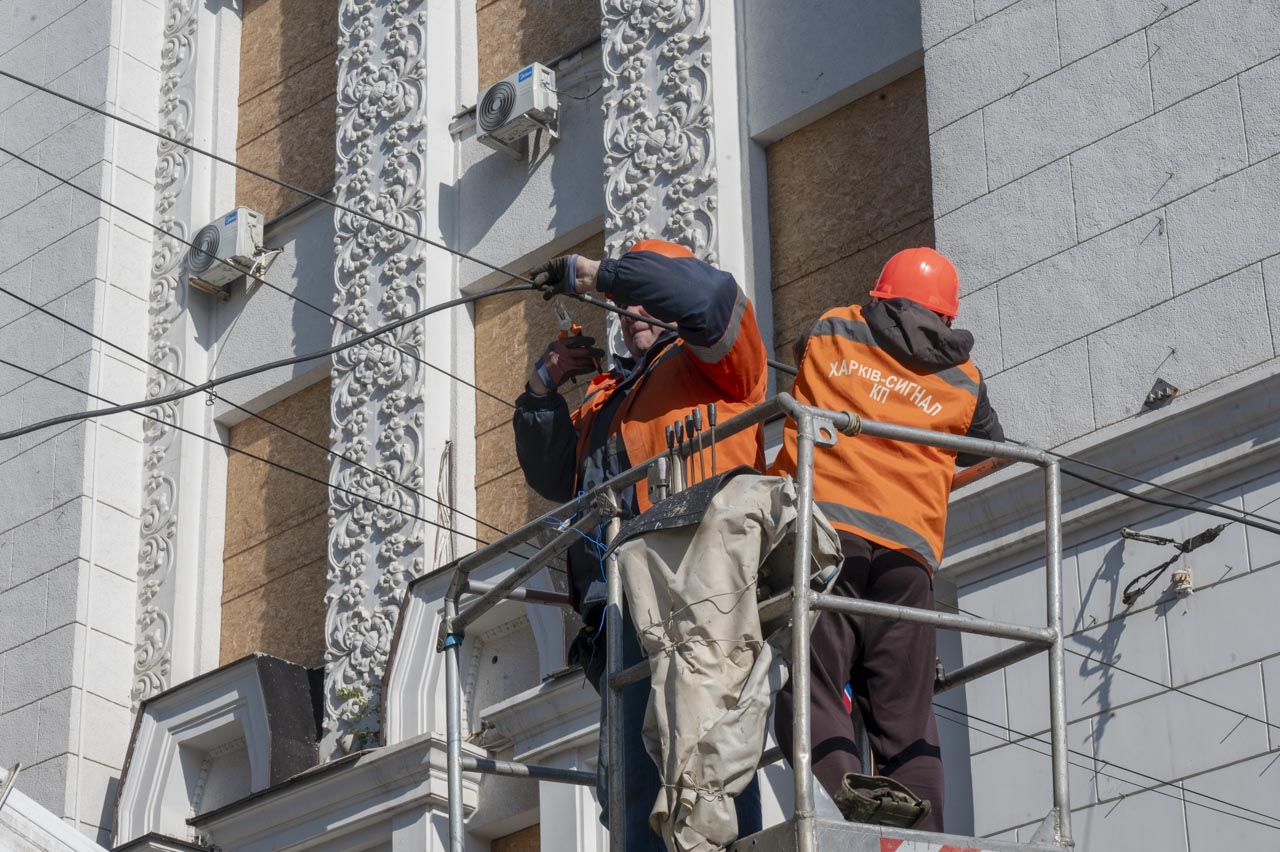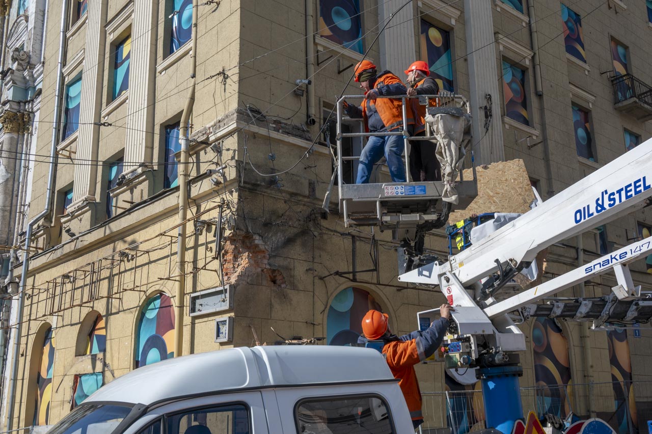 Водночас Харків займається ліквідацією наслідків учорашніх, 20 квітня, російських ударів по місту. На місці падіння уламків ворожої «герані» в Основ’янському районі ще з ночі закривають контури постраждалих будинків, прибирають уламки та бите скло.