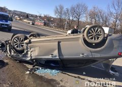 Автомобиль Ford вследствие столкновения перевернулся на крышу.