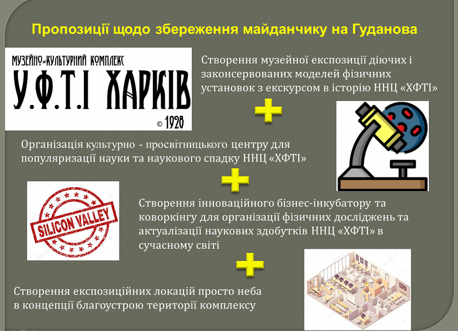 Более того, сейчас ННЦ «ХФТИ» вместе со специалистами Научно-методического центра развития музееведения и памятниковедения формирует предложения и изучает возможность организации на основе площадки по ул. Гуданова, 13 музейно-культурного комплекса. Но такое дело требует, прежде всего, крупных инвестиций, которых, к сожалению, на сегодняшний день в ННЦ ХФТИ нет. И для создания такого музейно-культурного комплекса в самом деле нужна поддержка общественности и меценатов.